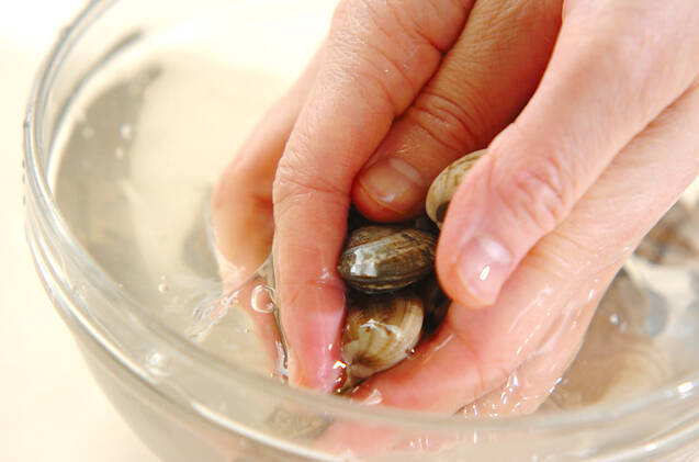 アサリは殻と殻をこすり合わせるように水洗いして、ザルに上げておく。