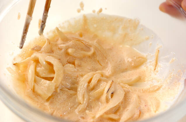 フライパンにオリーブ油、ニンニクを入れて強火にかけ、香りがたってきたら玉ネギを加え、しんなりするまで炒め合わせる。全体に炒められたら、<明太子ソース>のボウルに加えて混ぜ合わせる。