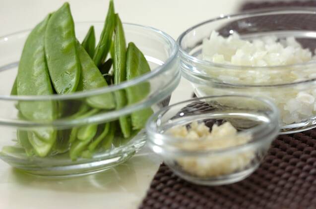 キヌサヤは筋を取る。玉ネギとニンニクはみじん切りにする。赤唐辛子は種を取り除く。