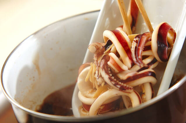 <後入れ調味料>の材料を加えて6~7分煮、イカを戻し入れる。イカが温まる程度に加熱したら器に盛って煮汁をかける。