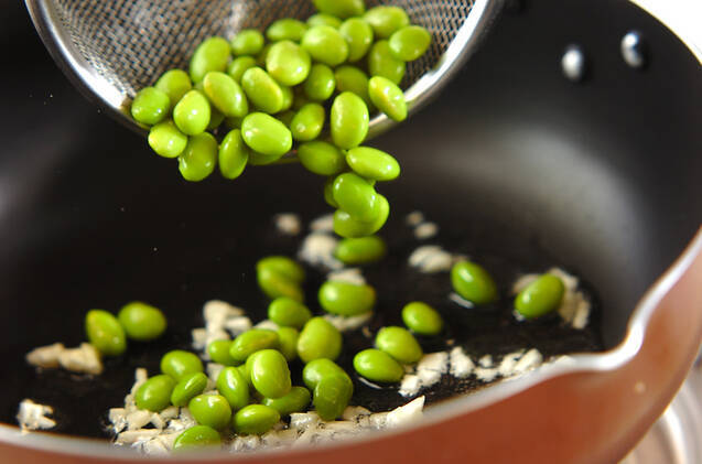 フライパンにサラダ油、ニンニクを入れて弱火にかけ、香りがたってきたら枝豆を加えてサッと炒める。
