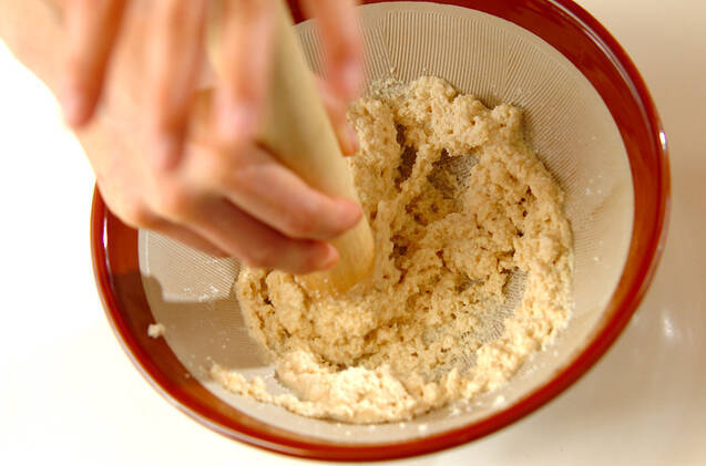 <和え衣>の材料をすり鉢に入れ、すりこ木でよくすり混ぜ、冷ましておく。