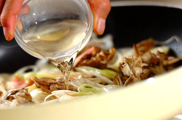 スパゲティをゆでる間に、大きめのフライパンにニンニク、オリーブ油を入れて中火で熱し、香りが立ってきたら、マイタケ、白ネギ、ベーコン、刻み赤唐辛子を加えて炒め合わせ、白ワイン、塩コショウで味を調える。スパゲティがゆで上がっていない場合はここで火を止める。