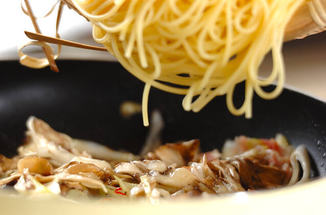 ゆでたスパゲティをザルに上げ、3のフライパンに加え、強火でサッと合わせる。塩コショウで味を調えて器に盛り、刻みのりを散らして粉チーズを振る。