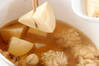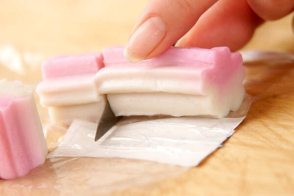 桜生麩は2cmの長さに切り、水煮タケノコは食べやすい大きさに切る。