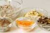 鍋にだし汁、<調味料>を入れ、ミツバ以外の具を加えて火にかける。煮立てば火を弱めて3~4分煮、ザルに上げ、具と煮汁に分ける。