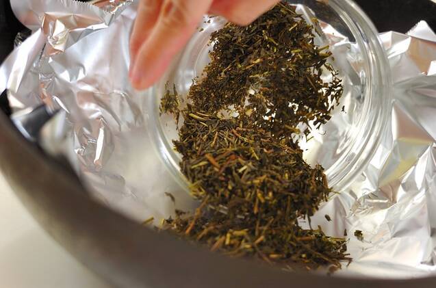 中華鍋、またはステンレス鍋などにアルミホイルを敷いてお茶の葉と砂糖を入れ、網をセットして強火で熱する。煙が出てきたらエビを並べ、火を少し弱めて蓋をして燻す。