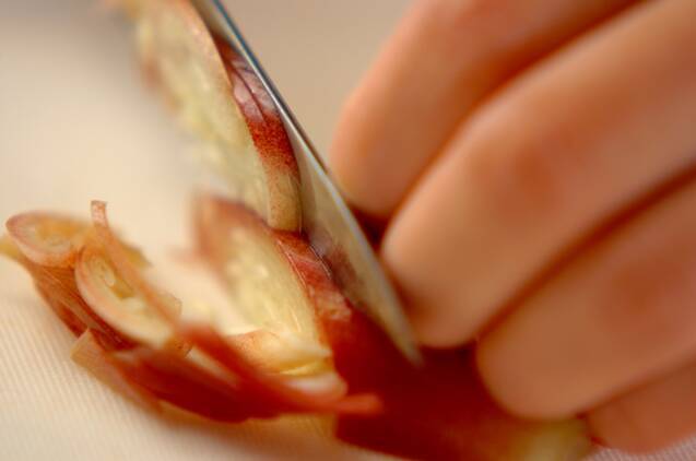 ミョウガは縦半分に切り、さらに斜め薄切りにする。