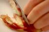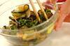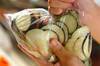 ビニール袋にナス、キュウリ、ミョウガ、分量外の塩を入れ、しんなりするまでビニール袋ごともむ。空気を抜いて袋の口を縛り、10分置く。