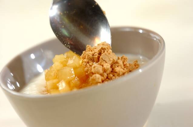 器にプレーンヨーグルトを入れて(1)をのせ、上からきな粉とシナモンパウダーを振る。