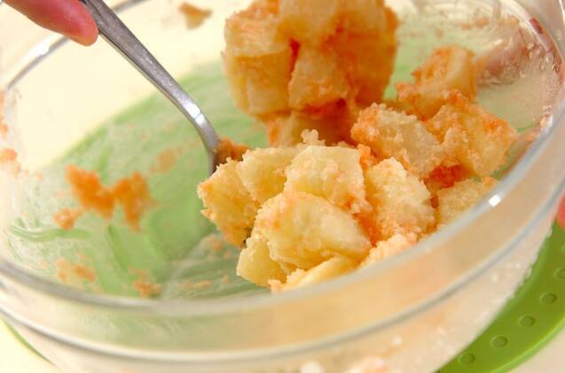 粗熱を取って、混ぜ合わせた<タラコマヨネーズ>と混ぜ合わせる。サラダ菜をしいた器に盛り、プチトマトを添える。