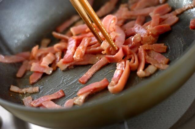 フライパンにオリーブ油を中火で熱し、ベーコンを炒める。