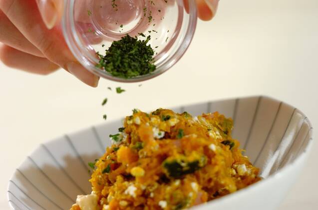 カボチャとベーコン、カッテージチーズを混ぜ合わせ、さらにタルタルソース、塩、粗びき黒コショウで味を調える。器に盛り、ドライパセリを振る。