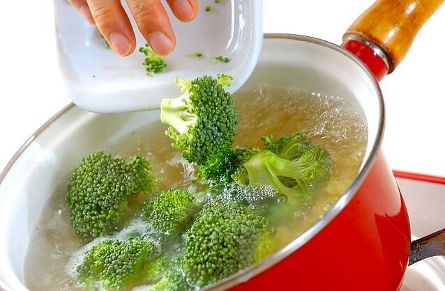 ブロッコリーは小房に分ける。たっぷりの熱湯に塩を入れ、マカロニを指定時間通りにゆでブロッコリーを加え、ひと混ぜしてザルに上げる。