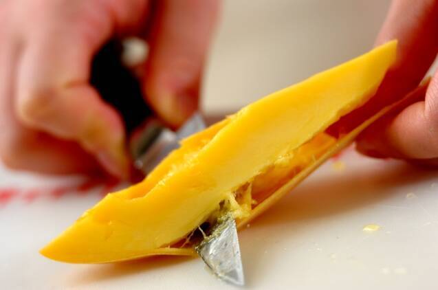 マンゴーは包丁で果肉を削ぎ取り、ザク切りにする。パイナップルはザク切りする。