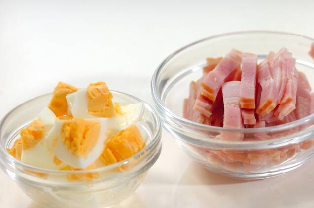 ベーコンは細切りにし、フライパンで少しカリッとなるまで焼き、キッチンペーパーの上に広げて粗熱を取る。ゆで卵はザク切りにする。
