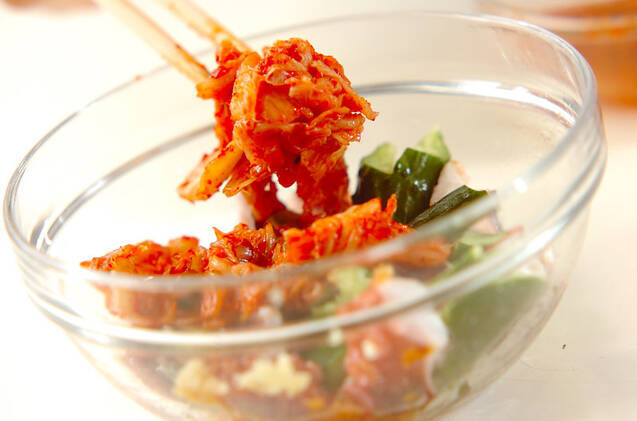 <調味料>のボウルに、ゆでタコ足、キュウリを入れてよく混ぜ、白菜キムチを加えてさらに混ぜ、器に盛る。