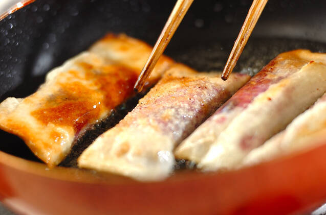 フライパンにサラダ油を熱し、(1)を両面こんがりと揚げ焼きにし、器に盛る。