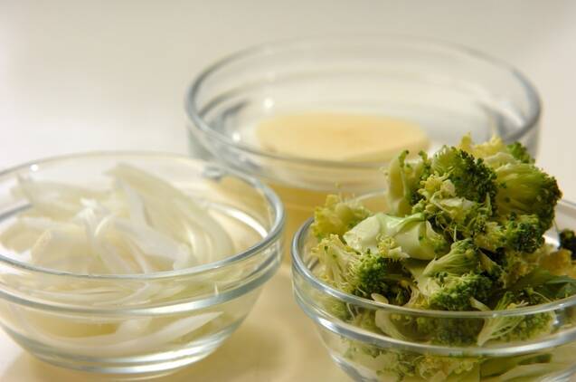 ブロッコリーは芯も粗めのザク切りにする。玉ネギは縦薄切りにする。ジャガイモは皮をむいて水に放つ。