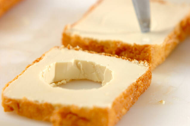 厚揚げは厚みを半分に切り、真ん中をくり抜く(卵が入るくらいの大きさ)。