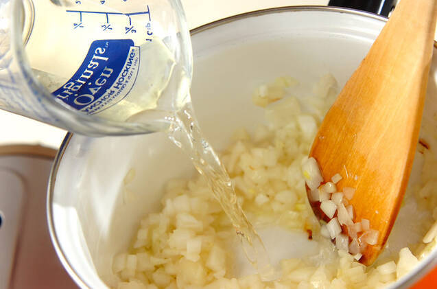 鍋にオリーブ油、玉ネギ、ニンニクを入れて中火にかけ、玉ネギがしんなりしてきたら白ワインを加える。強火にしてアルコール分を飛ばす。