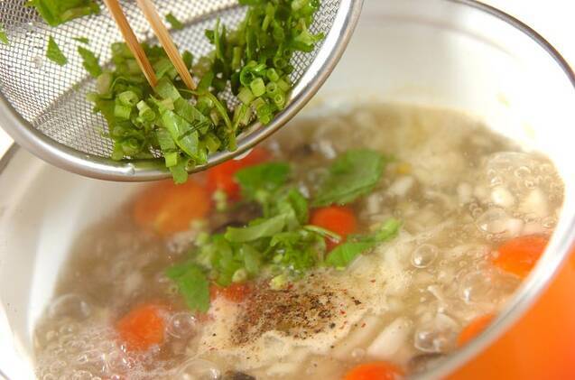 アサリ、プチトマト、ブラックオリーブ、<スープ>の材料を加え、アサリが開いたらアクを取る。塩コショウで味を調え、セリを加えてひと煮たちさせ、器に注ぎ分ける。(ヒント)セリの代わりに刻みネギやドライパセリを使ってもいいですよ!