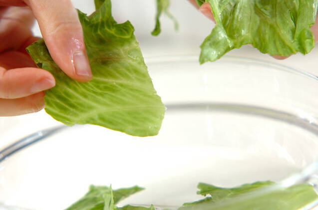 レタスは手でちぎって冷水に放ち、パリッとしたら水分をしっかりきり、ゴマ油をからめる。