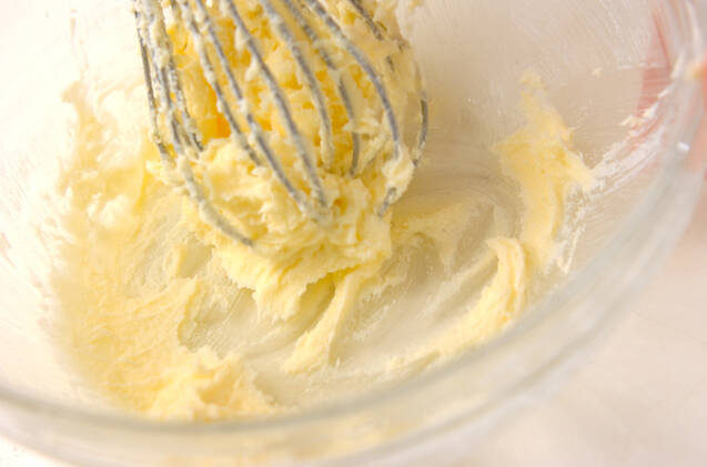 室温にもどしたバターを泡立て器でクリーム状に練り、グラニュー糖を加えて白っぽくなるまでよく混ぜ合わせる。