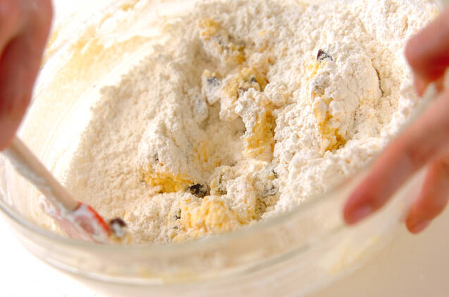 ラム酒ごとレーズンを加えて木ベラやゴムベラでザッと混ぜ、更に振るった粉類を加え、サックリ切るように混ぜ合わせる。