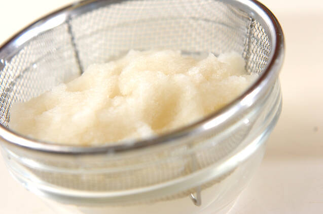 大根おろしはザルに上げ、軽く水気を切って作り置き甘酢と、ユズの絞り汁を混ぜ合わせる。