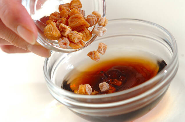 お米ともち米は合わせて水洗いし、ザルに上げる。干し貝柱はサッと水洗いし、<調味料>の材料と合わせる。