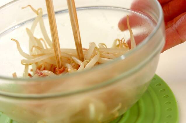 <マリネ液>のボウルにモヤシとベーコンを入れて混ぜ、冷蔵庫で15分くらいおく。