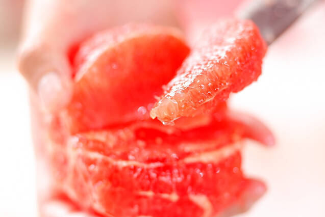 グレープフルーツは包丁で皮をむき、中の薄皮も取って、1房の半分の厚さにする。
