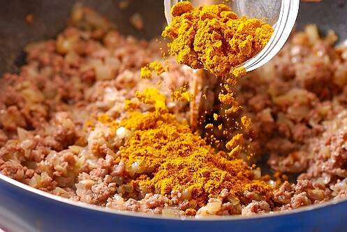 合いびき肉を加えてよく炒め、色が変わればカレー粉を加えて更に炒め合わせる。