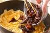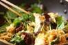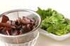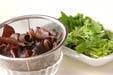 キクラゲはぬるま湯で柔らかくもどし、固い部分を切り落としてひとくち大の乱切りにする。煮立った熱湯に3分漬け、ザルに上げる。