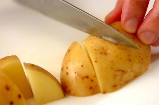 新ジャガイモは皮をよく洗い、食べやすい大きさに乱切りにする。