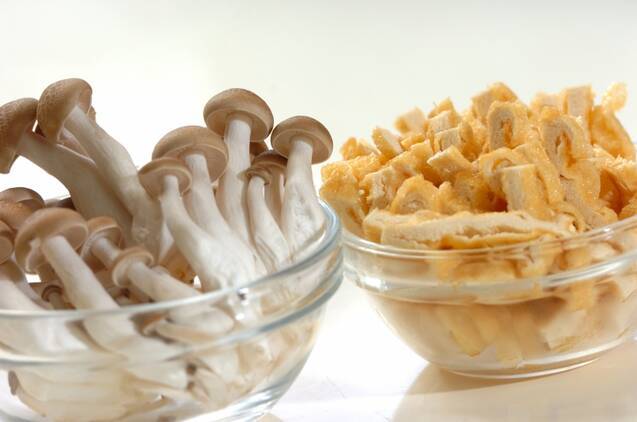 シメジは石づきを切り落とし、小房に分ける。油揚げは熱湯をかけ、食べやすい大きさの細切りにする。