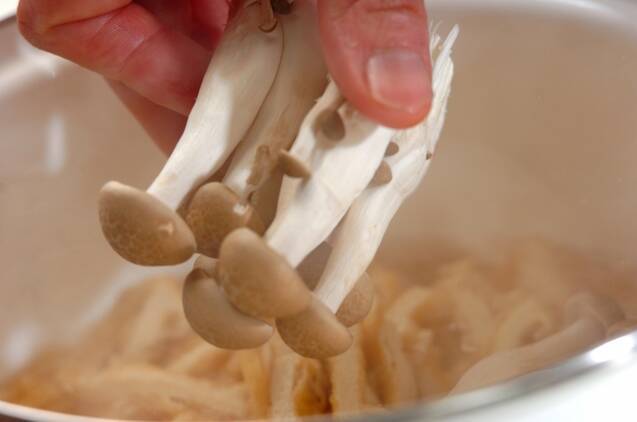 鍋にだし汁を入れて強火にかけ、煮たったらシメジ、油揚げを加える。