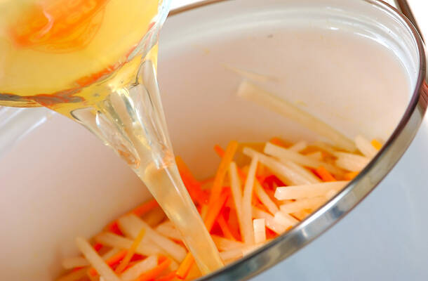 鍋にゴマ油、ショウガを入れて中火にかけ、香りが立ってきたら大根、ニンジンを炒め合わせ、だし汁を加える。