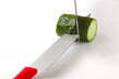 刺した包丁をまな板と平行にして、もう1本の包丁で刺した包丁まで斜めに切る。