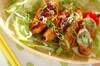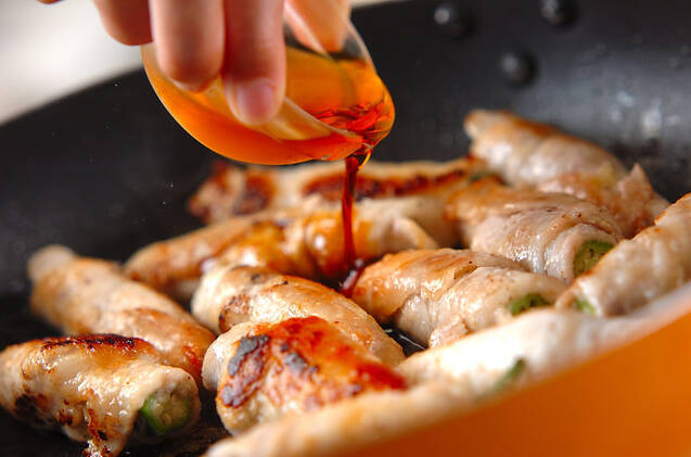 <調味料>を加え、火を少し強めて全体にからめる。器にレタスを敷いて豚肉巻きを盛り合わせ、刻みネギを散らし、プチトマトを添える。