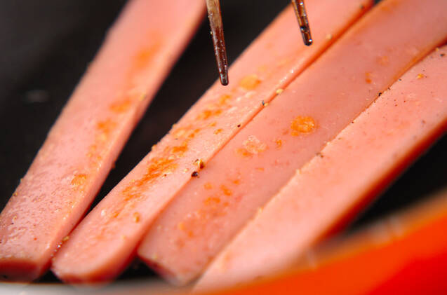 魚肉ソーセージはフライパンにサラダ油をしき、中火で軽く焼き目が付く程度焼き、塩コショウをする。