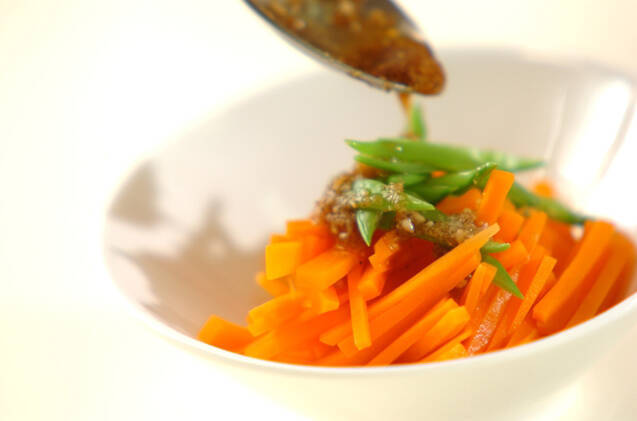 器にニンジン、キヌサヤを盛り合わせ、<ゴマドレッシング>をかける。