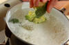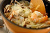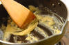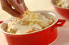 フツフツと泡が出てきたら牛乳を一気に加え、泡立て器でダマが出来ないようによく混ぜ合わせる。トロミがついてきたら、顆粒スープの素、塩コショウ、ナツメグを加え、木ベラで混ぜる。
