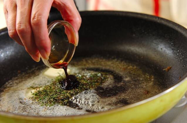 <ハーブバターソース>を作る。フライパンの余分な油をさっと拭き、バターを入れ、半分溶けたら残りの材料を加える。