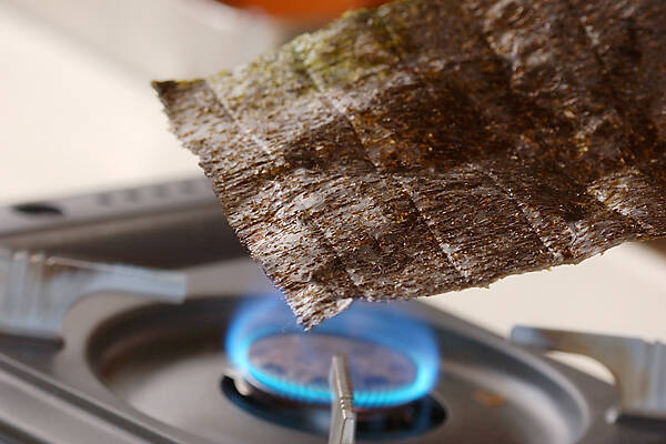 のりの片面にゴマ油を塗り、塩をふりかけ、両面軽くガス火であぶり、4等分に切る。残り野菜はスティック状に切り、冷水につけてパリッとさせ、大葉やレタスは冷水で洗う。どちらもしっかり水気を切っておく。
