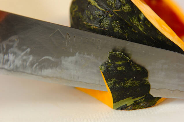 カボチャは種とワタを取り、皮を削ぎ落としてひとくち大に切る。