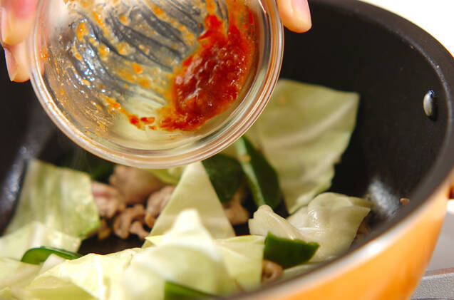 しんなりしてきたら、混ぜ合わせた<調味料>の材料を加え、炒め合わせる。