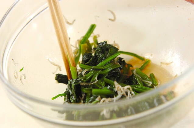 <合わせダレ>のボウルに、ホウレン草を加え、全体にサッと和えて器に盛る。