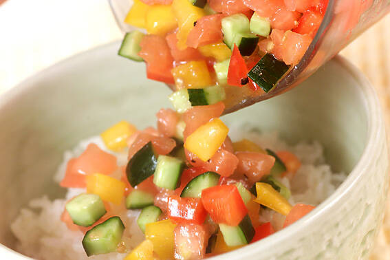 器にご飯をよそい、<ソース>を全体にかけ、3のサバを盛り合わせ、バジルの葉、炒めたローズマリーを添える。最後に、電子レンジで3分加熱して少しトロミをつけたバルサミコ酢をかける。電子レンジは600Wを使用しています。